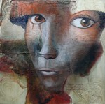 2023Portret in Encaustic op houtblok gebrande randen Shugiban.
