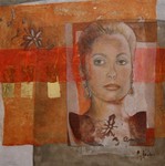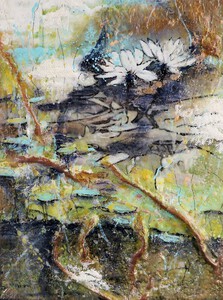 2022ENcaustic op aquarelpapier met notenbolster en bladmetaal story telling