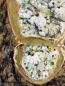 2022Encaustic op aquarelpapier met collage notenbolster en bladmetaal