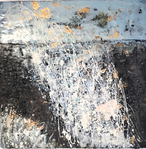 2022Encaustiek op houtenondergrond blauw met goud met print